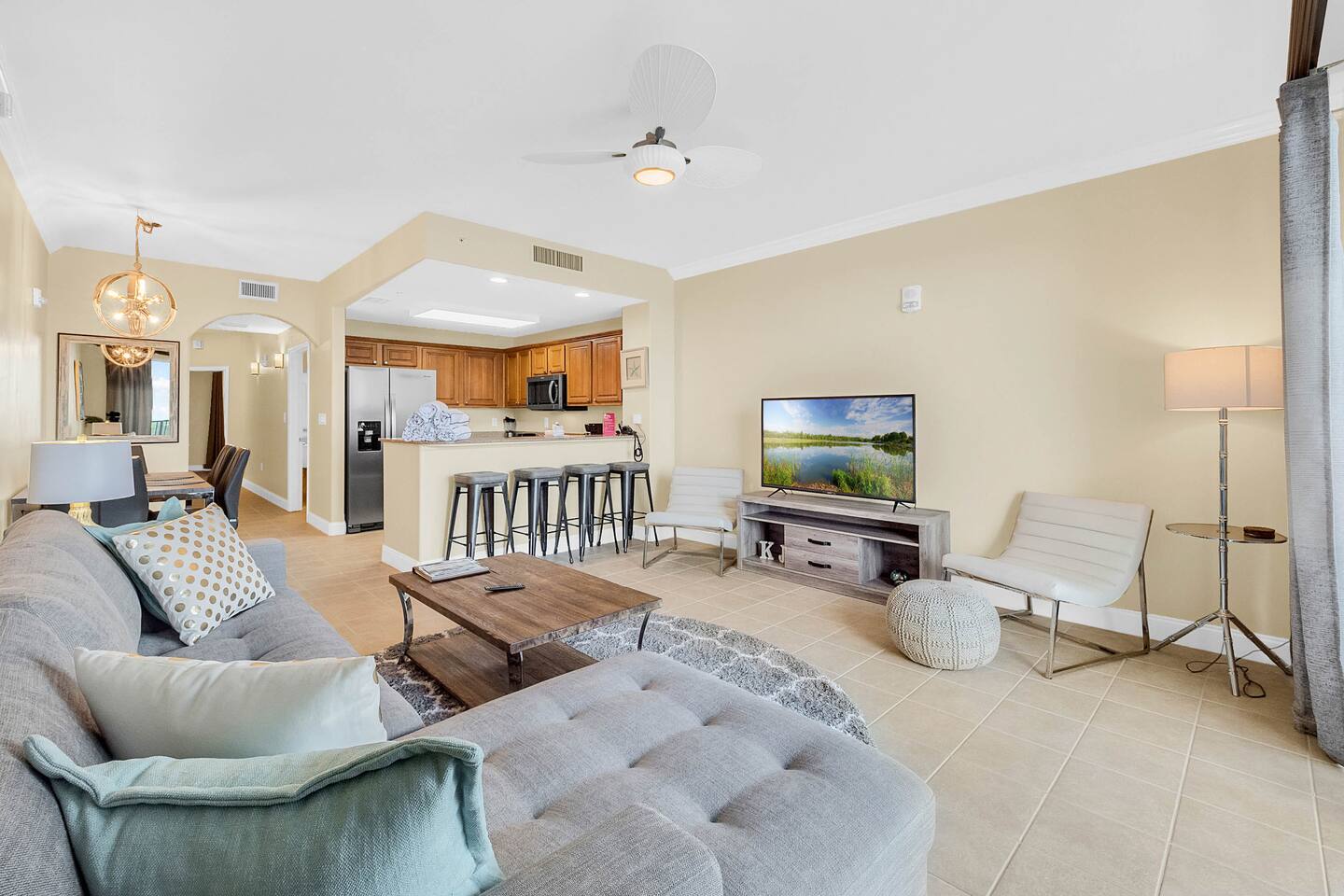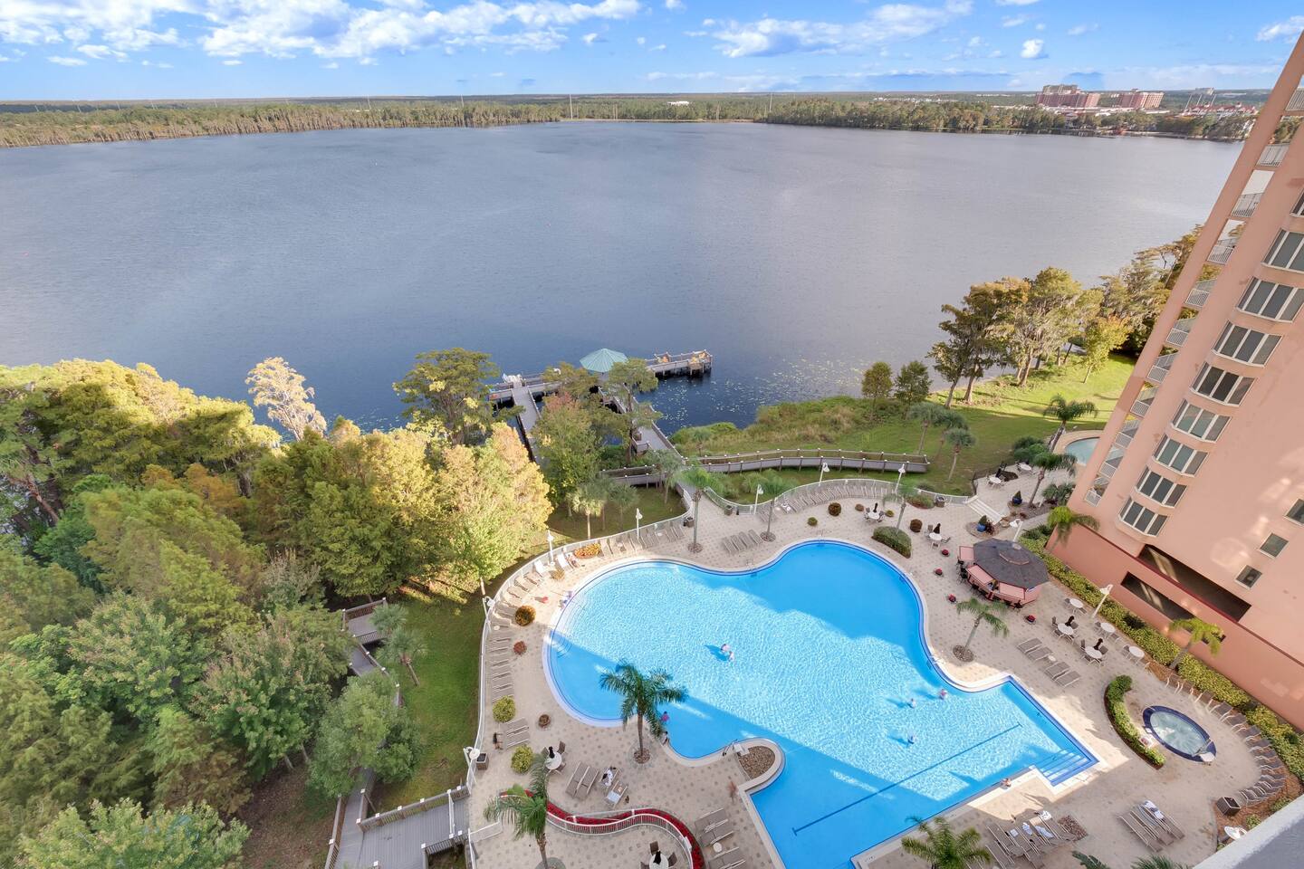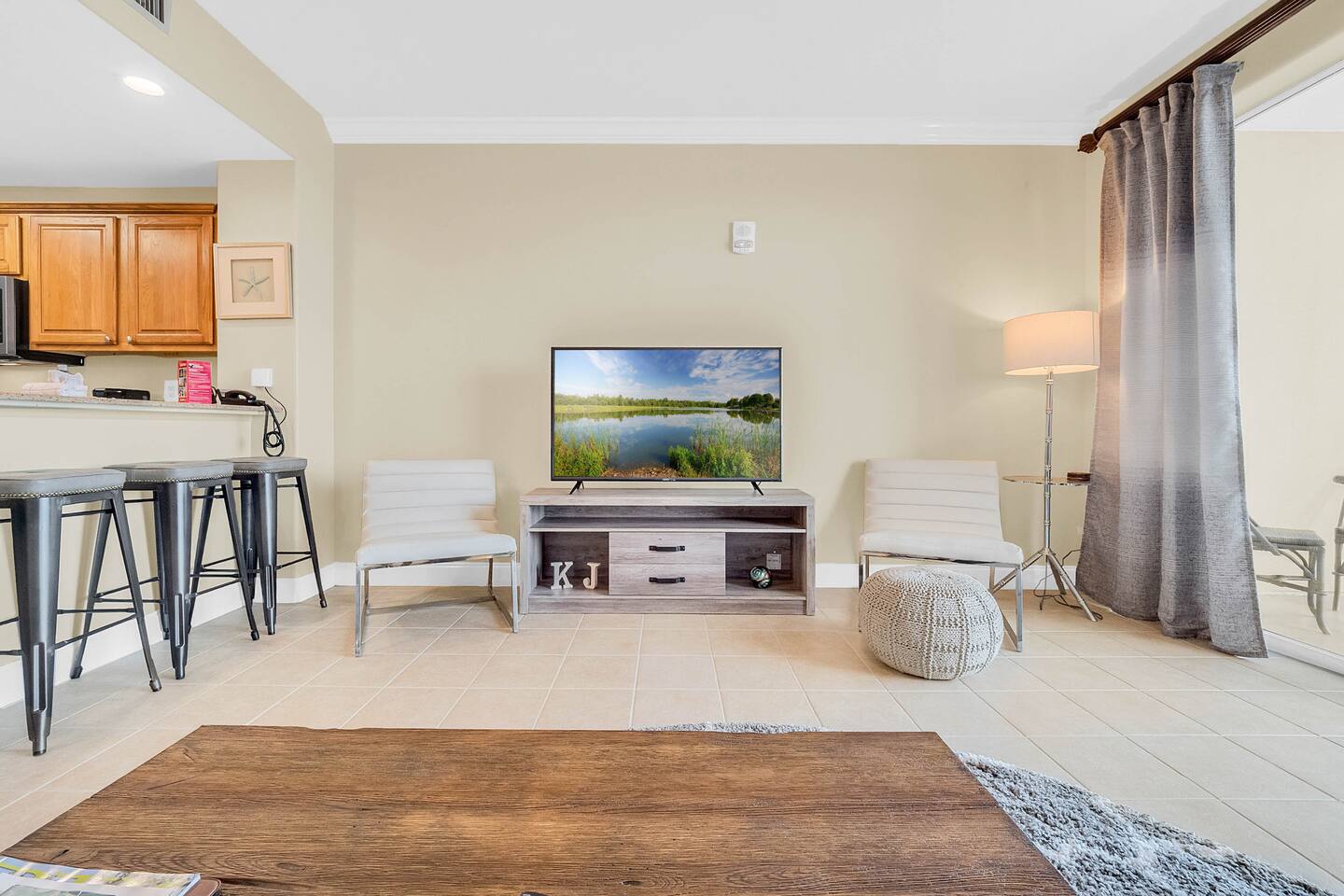K&J Orlando is located less than 10 minutes away from the gates of Disney. The space has been recently updated with new furniture, lighting, and appliances. You will love the floor to ceiling views of Lake Bryan and the modern decor. The resort itself features a heated pool, hot tub, tiki bar, game room, weight room, and kiddie pool. Its also has a beautiful boardwalk where you can experience the stunning natural beauty of the marsh at the edge of the lake. We hope you will visit soon!